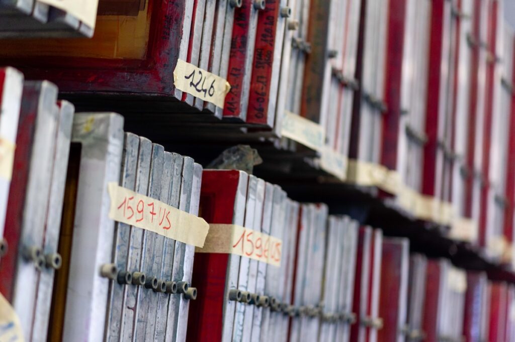 Die Siebdruckfilme werden in unserer Fotolithografie-Abteilung erstellt und anschließend auf die für die jeweilige Bearbeitung geeigneten Siebrahmen eingraviert. Danach werden die fertigen Rahmen in die Siebdruckabteilung gebracht und auf den Maschinen eingerichtet.