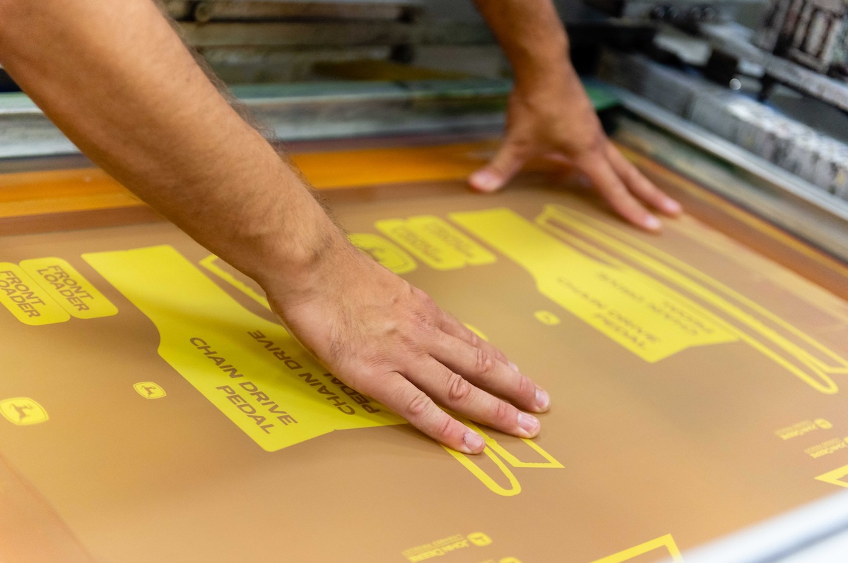 Nach dem Einrichten bereiten die Drucker die Farben auf den Siebrahmen vor. Die Registergenauigkeit wird eingestellt und die Qualität des gedruckten Bogens nach dem Druck überprüft.